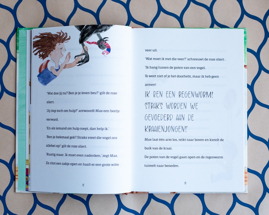 Die middag zoeft er iets voorbij en hoort ze heel hard ‘Help!’. Max springt zonder na te denken en hangt aan de poten van een kraai. Die kraai heeft een regenworm voor zijn kraaienkindjes en die worm roept hard om hulp. Max verzint een manier om de regenworm te bevrijden. Samen landen Max en Ribbeltje in een boom. Als Max wil weten waar regenwormen vandaan komen rijst meteen te vraag waar zij dan zelf vandaan komt? Komt ze misschien ook onder de grond vandaan? Was ze als baby glibberig en wilden haar ouders haar daarom niet? Maar Dieu weet het niet en zal altijd voor haar en haar vrienden zorgen.