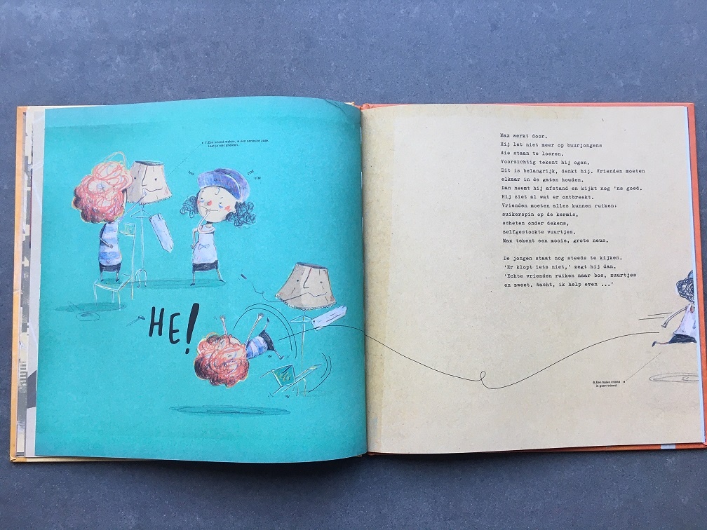 Het mooie aan deze boek vind ik de dubbele betekenis van ‘een vriend maken’. Max pakt dit heel letterlijk op, en ziet gewoon over het hoofd dat zijn buurjongen klaar staat om met hem te spelen. Ik heb het hier met mijn jongste dochter leuk over kunnen hebben: hoe maak je nu eigenlijk vrienden? En wat kunnen vrienden samen doen?