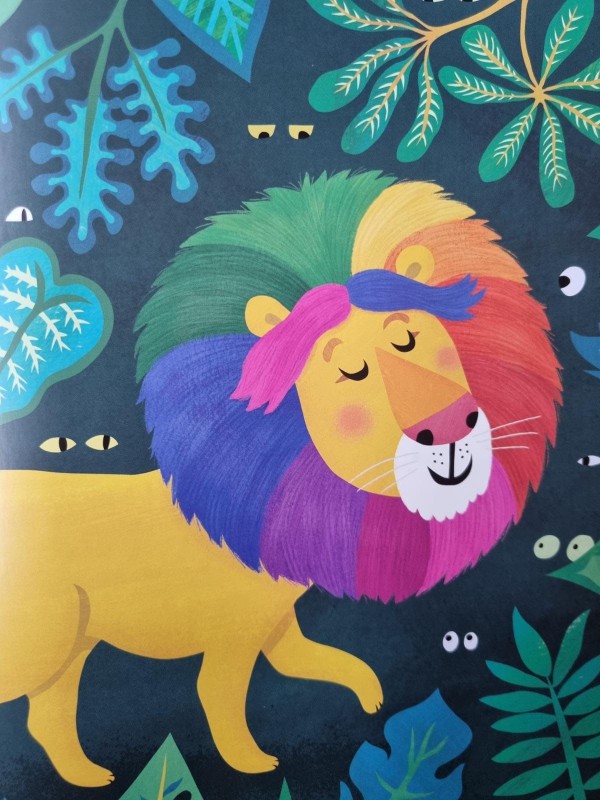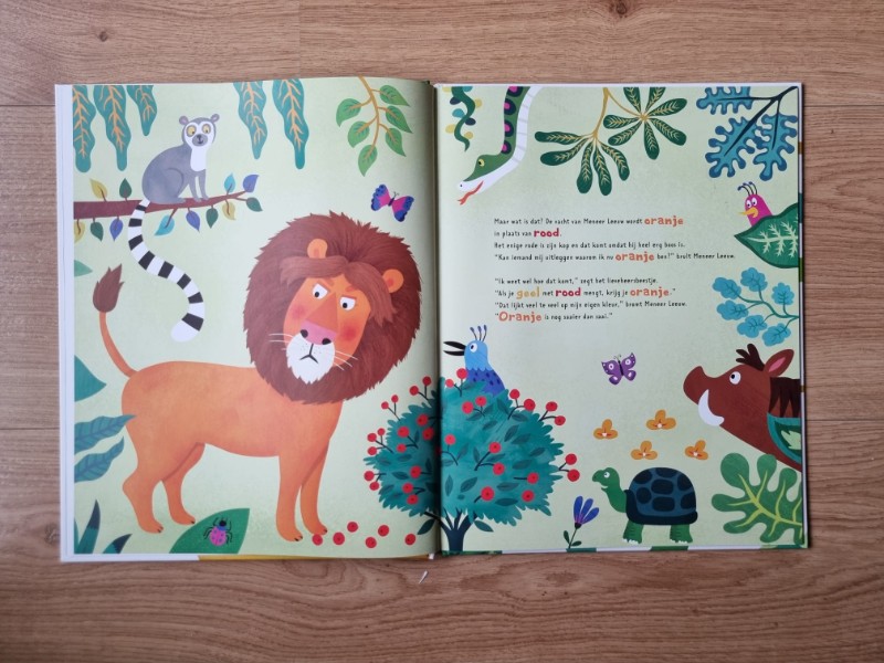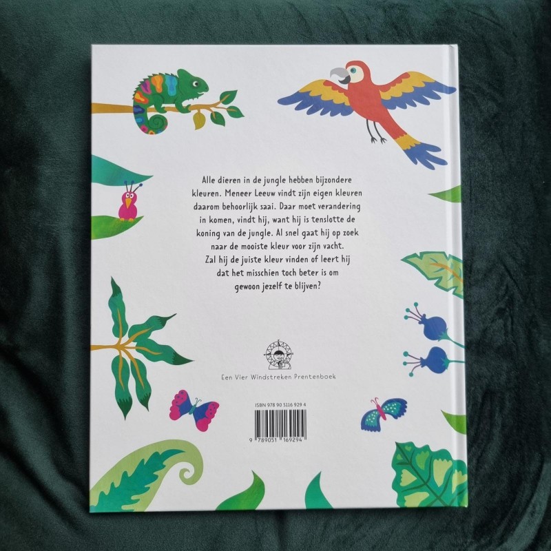 Zou jij soms ook wel eens je haren in een gekke kleur willen verven? Gewoon om te zien hoe dat staat? Meneer Leeuw wil kleur! Hij vindt het maar saai, dat gele en bruine. In de jungle leven dieren met bijzondere kleuren, hij is jaloers. Ik kan ook jaloers zijn op mensen die gewoon durven. Een keer iets felgekleurds aantrekken alleen al, ik heb dan toch het gevoel dat ‘iedereen kijkt’. Terwijl het bij de ander zo prachtig staat. Stiekem lijk ik wel een beetje op Meneer Leeuw dus.