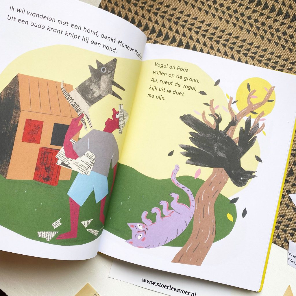 In de tuin zijn de kat en de vogel ook aan het spelen. Maar Meneer Papier knipt een hond, dat wil hij graag. De dag ontvouwt zich in een aangename beleving en er worden allerlei leuke dingen geknipt die handig zijn. Als zijn papiertjes op zijn, doet hij gelukkig aan recyclen. Vervolgens knipt hij namelijk uit eerdere knipsels weer nieuwe dingen. Dit eerste verhaal is een fijne fantasievolle kennismaking met deze best man en zijn mogelijkheden.