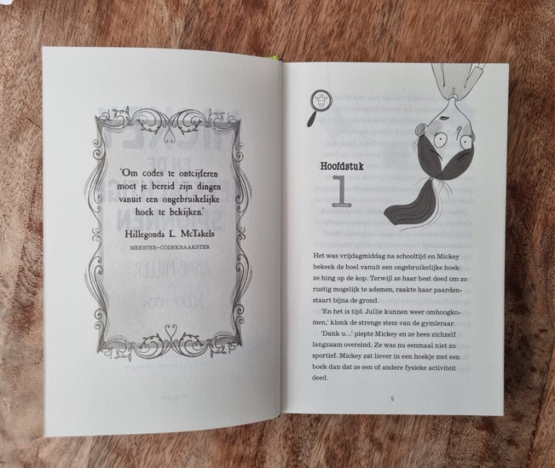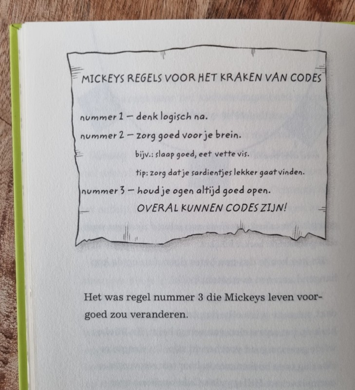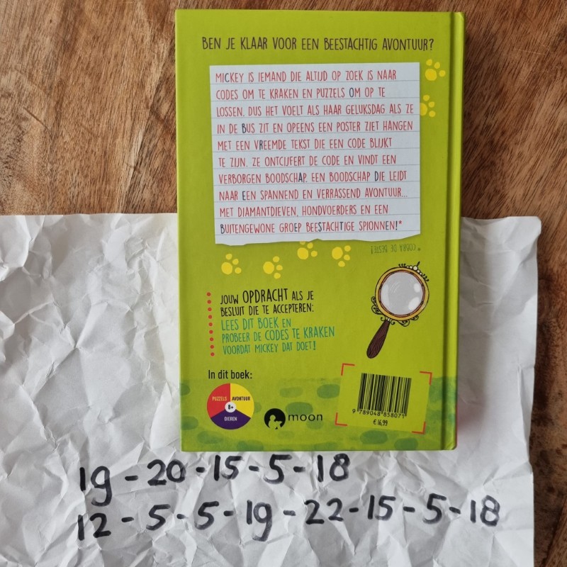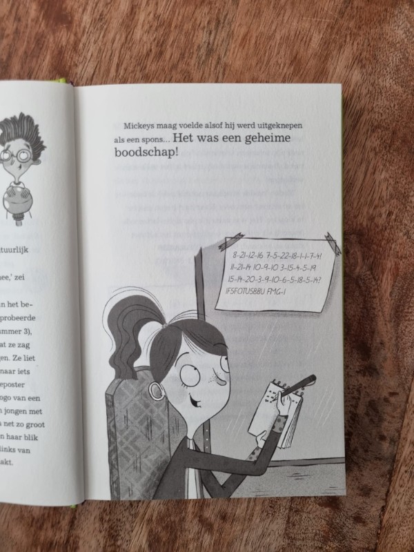 Op het moment dat ik Mickey en de beestachtige spionnen wil gaan recenseren ben ik het boek kwijt. Dat is een goed teken, want dan ligt hij in een bed van één van mijn dochters. En ja hoor, na even zoeken blijkt hij onder het kussen van mijn oudste te liggen. Naast een opschrijfboekje en een pen. Dit opschrijfboekje staat vol met geheime codes. Dat is dus wat dit boek met je doet, bedenk ik mij. Al een paar dagen zie ik mijn beide dochters (van 8 en 9) fanatiek aan de slag gaan met de codes die Mickey in het boek moet kraken.