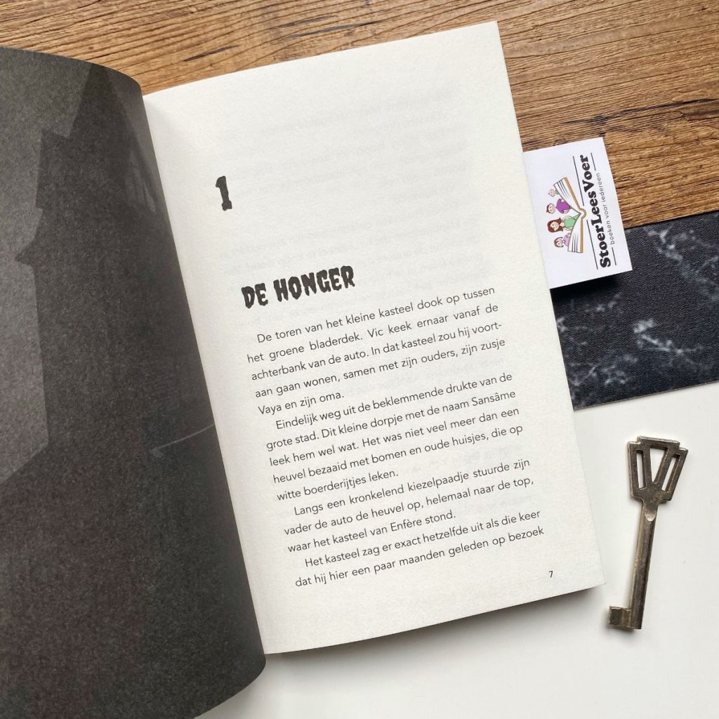 De bladspiegel is lekker luchtig. Korte zinnen, korte alinea’s, soms wat extra wit ruimte rondom woorden. De regels zijn duidelijk, concreet en kort. Hier en daar wel wat rijkere woorden zoals glooiend en jachtig. De Braeckeleer komt uit België en hier en daar lees je dat ook, maar nergens is dat storend. Het voegt juist een aangename charme toe. Middernacht Schaduwhotel is dus uitnodigend voor alle soorten lezers. Het verhaal zelf staat als een huis en is echt heel erg spannend. En verrassend zoals ik al aangaf. Ik lees veel (jeugd)horror en Braeckeleer stopt niet waar de meesten wel zouden stoppen en dat vind ik heel erg tof.