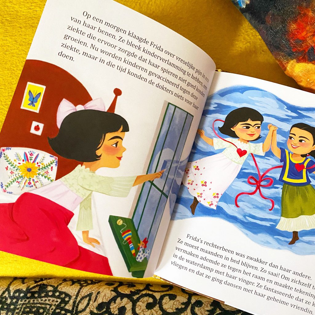 Het verhaal in Mijn Gouden Boekje over Frida Kahlo is interessant. Ondanks dat ik al meerdere boeken heb over haar. Toch staan er weer voor mij nieuwe dingen in. Ik krijg een beetje het idee dat er goede research is gedaan naar zowel haar leven als naar andere kinderboeken over Frida. Het kan toeval zijn maar er staan echt wel weer andere dingen in. Het stukje over de bijzondere middelbare school waar ze naar toeging en hier nogal wat kattenkwaad uithaalde, was bijvoorbeeld nieuw voor me. (Of vergeten, ook dat gebeurd wel eens)