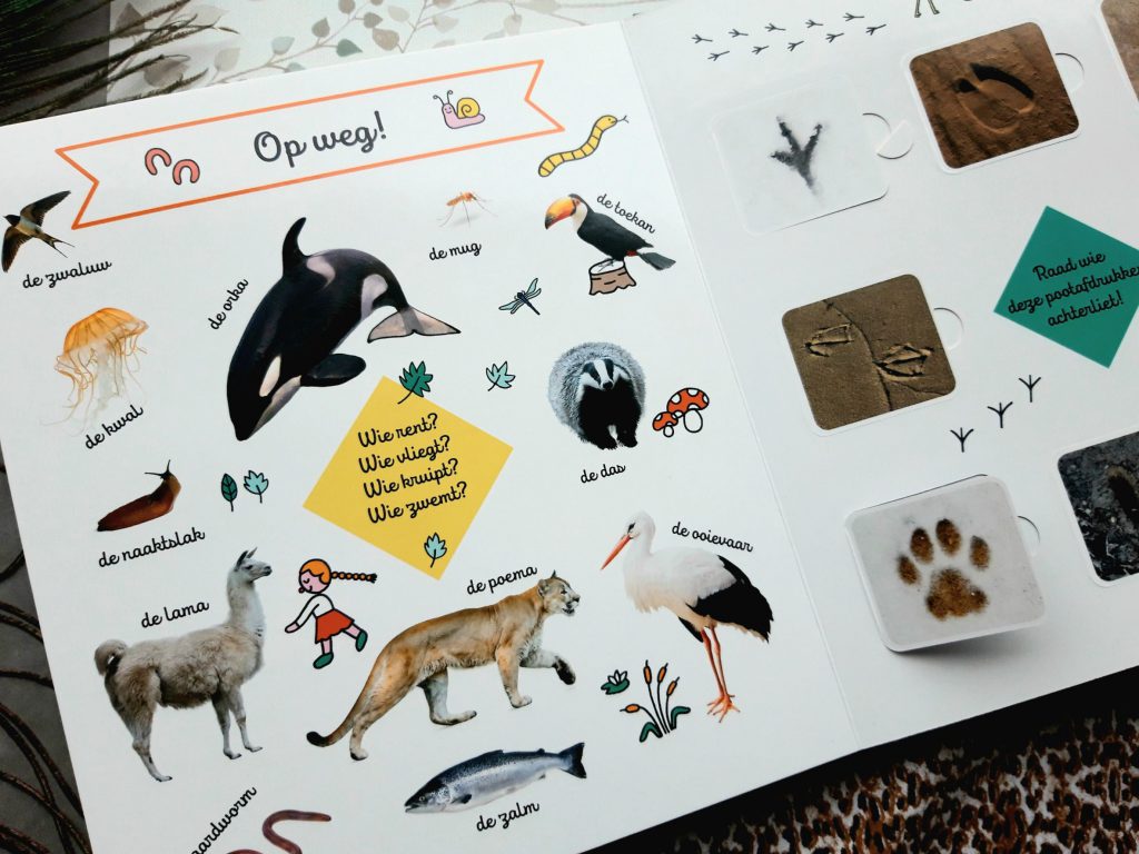 Maar er is nog heel veel meer. Bijvoorbeeld een bladzijde met allerlei babydieren, maar ook de verschillende woonplekken en pootafdrukken van dieren. Hoe ziet de pootafdrukken van een kat er bijvoorbeeld uit? En sommige dieren hebben ook een bijzonder kenmerk. Welk dier heeft bijvoorbeeld tentakels? Een heel leerzaam boek dus! Voor kinderen vanaf 2 jaar hartstikke leuk om de dierenwereld te ontdekken.