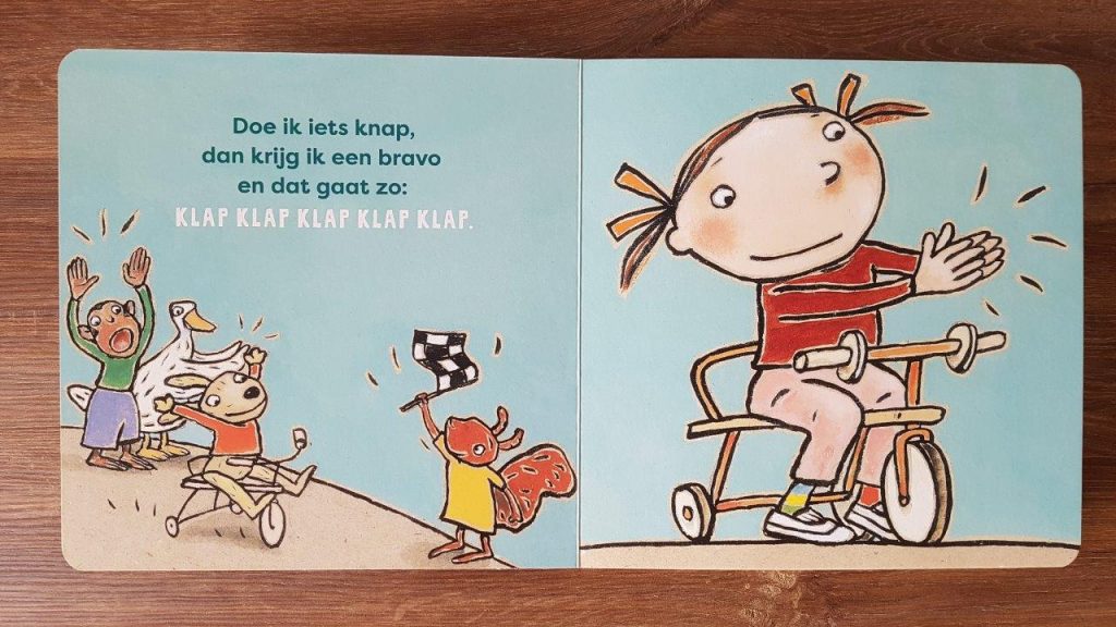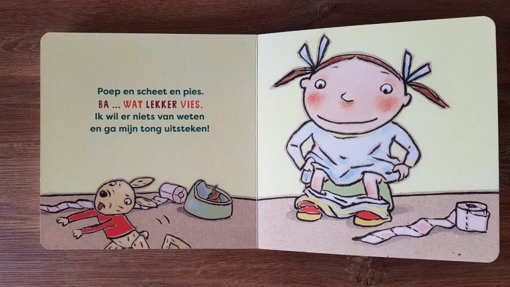 Aan twee bladzijdes van Mijn handen dansen en mijn mondje is een rondje heb ik niet zoveel aandacht besteed tijdens het voorlezen. Want dat zijn juist net dingen die ik mijn zoontje níét wil aanleren. Het plaatje waarbij het meisje in haar handen klapt op haar fietsje… Mijn zoontje is van zichzelf nogal een stuntman. Ik heb hem onlangs wijs weten te maken dat je áltijd twee handen aan het stuur moet houden, ook als je stil staat. En de andere is die waarbij het konijntje poep en scheet en plas zo vies vindt dat het wegrent. Mijn zoontje zit in een serieuze fase en neemt dit soort grapjes letterlijk. Ik ben blij dat hij het laatst juist niet vies vond nadat hij voor het eerst op het potje plaste!