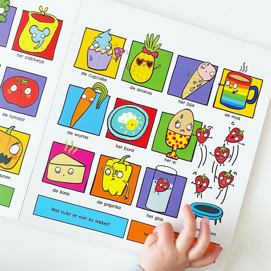 Ik heb nu woordenboeken die lief geïllustreerd zijn, die foto’s hebben, of juist een beetje spannend zijn. Maar een ‘Mijn knotsgek woordenboek’, hadden we nog niet. En wat is dat leuk een woordenboek met humor erin. Mijn jongste dochter van 2 jaar snapt echt de humor en moet hard lachen! Een baby in bad met een schildpad, springende aardbeien, tongen die uitgestoken worden en een muis die de kruimels van de vloer eet. Er is zoveel te zien en mijn dochter heeft kennelijk al haar eigen humor. Heel tof om dat door dit boek te ontdekken.
