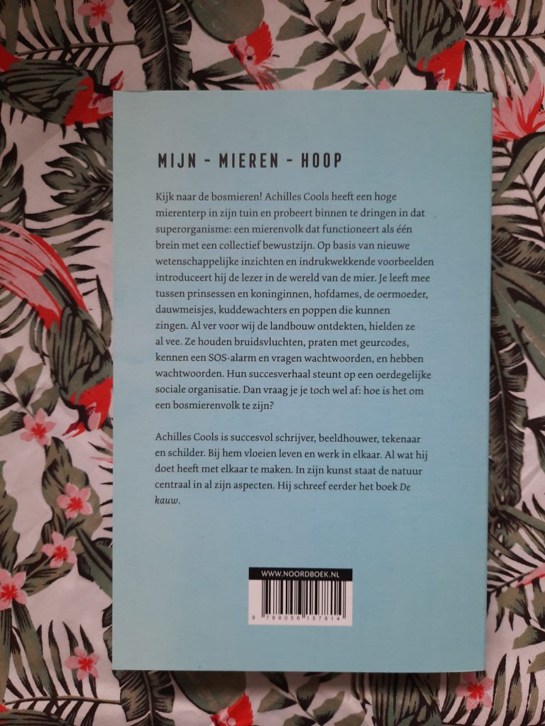 Mijn – Mieren – Hoop een slim superorganisme in de tuin is geschreven en getekend door Belgische kunstenaar Achilles Cools. Een verrassend boek over de mierenhoop van bosmieren in zijn tuin, andere dieren en gesprekken met o.a. zijn kleindochter hierover. Hij bestudeert de dieren minutieus en maakt er prachtige tekeningen van. En een beetje tussen de regels door legt hij ook de link met de mens. Met hoe wij ons gedragen en ook over de dierlijke kant van ons. Een aanrader, ook als je niet van mieren houdt (zoals ik!).