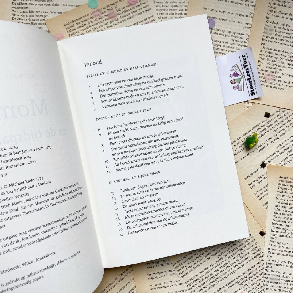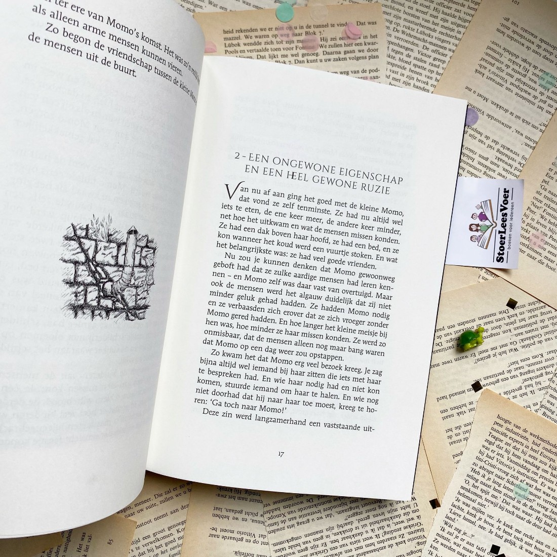Ik vind deze herziene versie prachtig. De cover is geweldig ontworpen en die typografie zet zich voort in het boek met de titels. Wel heb ik veel tijd besteed aan het staren naar Momo in de illustratie op de cover. Staat ze nou met haar rug of buik naar ons toe? Ik meen een gezichtje te zien, dan staat ze dus met haar buik naar ons. Maar dan klopt haar grote mannenjas weer niet, want ik zie geen knopen. Wat dus betekent dat ze met haar rug naar ons toestaat. Ah mijn fantasie slaat op hol, kennelijk gevoed door de woorden van Michael Ende.