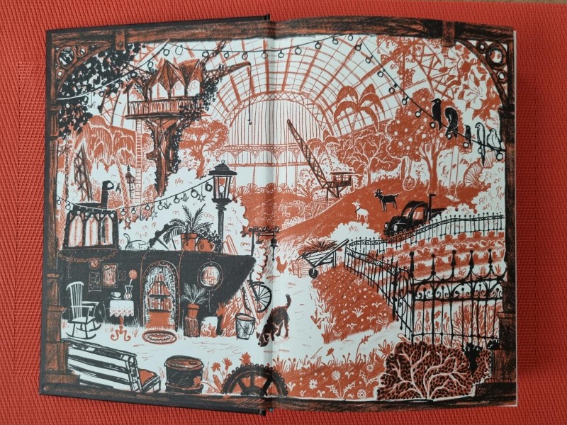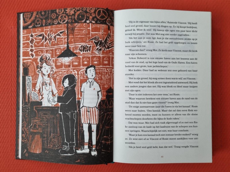 Mot en de metaalvissers is een dik boek vergeleken bij andere kinderboeken, maar daar merk je helemaal niets van als je aan het lezen bent. Ik vond het zelfs jammer dat ik het uit had, want ik waande mijzelf helemaal in de wereld van Mot. Het boek begint met één van de prachtige illustraties van Sophie Pluim. Deze illustratie is, net als de andere illustraties in het boek, gedetailleerd getekend in het zwart, wit en natuurlijk roestbruin. De illustraties geven een impuls aan het verhaal, maar behouden de mogelijkheid om je eigen fantasie de vrije loop te laten.