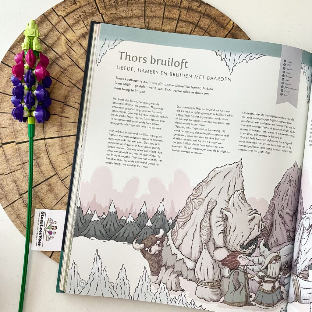 De opmaak is per wereld gelijk. Je start met een titelblad en daaronder de belangrijkste informatie. Die zit weer gegoten in een fijn geschreven uitleg. Het is voor oudere kinderen omdat er moeilijke woorden tussen staan. Zoals ‘almachtig opperwezen’ en termen vanuit die culturen. Uiteraard zijn er ook jongere kinderen die smullen van deze verhalen. Na de korte introductie met belangrijkste kenmerken volgt een overzicht van de goden uit die mythische wereld.