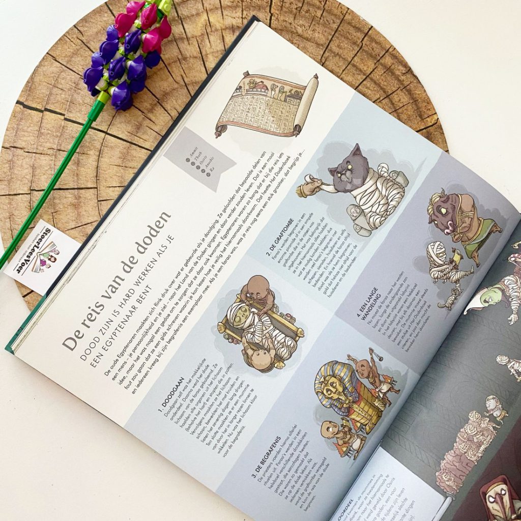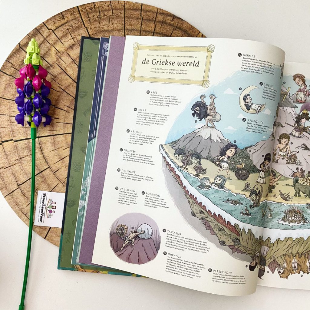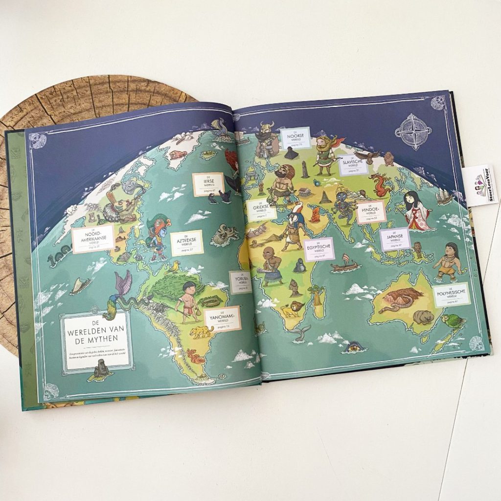 Veel boeken over mythologie richten zich vaak tot 1 bepaald gebied. Extra leuk vind ik het dus dat Mythenatlas maar liefst 12 mythische werelden behandeld! En dat start allemaal met een toffe wereldkaart. Heerlijk om meteen visueel een beeld te hebben. Kinderen vinden dat fijn, maar ook ik als volwassene. De wereldkaart is overigens ook meteen de inhoudsopgave. Het boekt nodigt dus meteen uit tot het ondernemen van je eigen reis. Ook iets wat ik fijn vind, niet een vaste route maar lekker dwalen door de bladzijden. Mijn oudste dochter wil starten in de Egyptische wereld dus daar starten we!