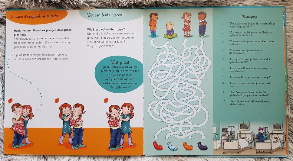Door de wist je datjes is het boek al aardig interactief, maar dat kan nog meer. Er zijn grote uitklapvellen over alle ruimtes in een ziekenhuis en beer moet ook even naar het ziekenhuis toe. We leren een liedje van CliniClown Karlijn en leren hoe we van een theedoek een mitella kunnen maken. Een doolhof, verschillende instrumenten en ten slotte een heuse miniquiz. Even controleren of je kind wel goed heeft opgelet 🙂