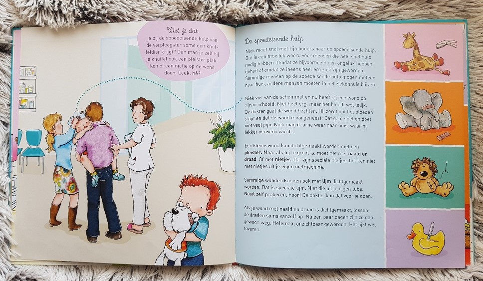 Op veel pagina’s zijn er vrolijke ronde tekstkaders met wist je dat? Hier staat nog wat extra leuke informatie in over naar het ziekenhuis gaan.