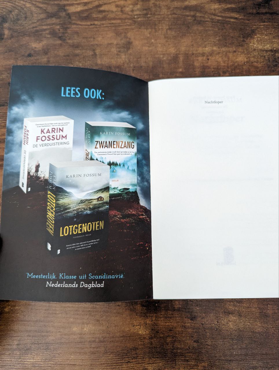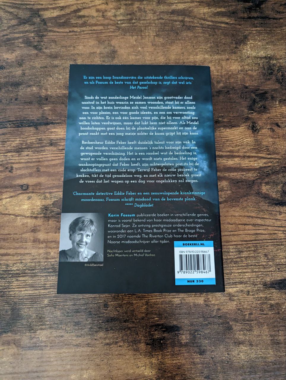 Ik begon in dit boek vol nieuwsgierigheid. Karin Fossum is een erg grote naam in dit genre en de achterflap trok mij aan. De cover vond ik mooi, pas later wordt echter duidelijk hoe passend deze is bij het verhaal. Een zonderling, op de vlucht, in een duistere omgeving die niet veel goeds voorspelt. Ik heb genoten van dit unieke verhaal.