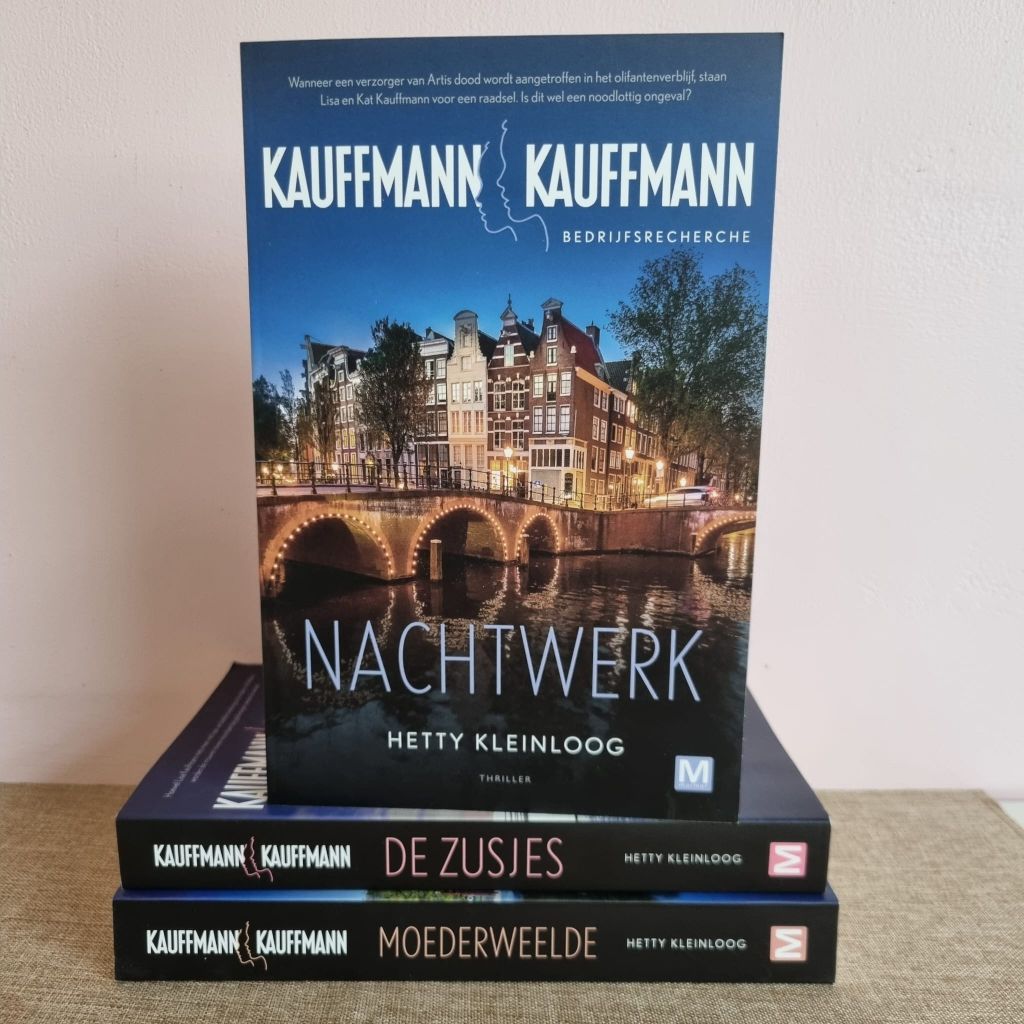 Direct na het lezen van De zusjes ben ik gestart met Nachtwerk. Dit is het tweede boek uit de serie Kauffmann en Kauffmann bedrijfsrecherche. Over De zusjes was ik erg enthousiast, dus ik keek er erg naar uit om het verhaal over Kat en Lisa verder te gaan lezen. Ook dit vervolg heeft mij absoluut niet teleurgesteld. Hetty Kleinloog heeft een vlotte schrijfstijl, waardoor ik door het verhaal heen vlieg. In dit deel gaan de zusjes Kauffmann en Kauffmann een onderzoek in Artis uitvoeren, het is dus een heel andere context in dit tweede deel.