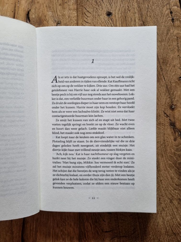 Naast verrassend vond ik de afronding ook wat ‘afgeraffeld’ overkomen. Alsof alle verhaallijnen die in het boek zitten allemaal volledig afgesloten moesten worden. Niet storend, want het geeft wel echt een ‘af’ gevoel, maar hier mist het verhaal wat diepte. Ik vind namelijk wel dat Hetty Kleinloog de zusjes Kat en Lisa mooi verdiept heeft in Nachtwerk. Ik heb ze nog beter leren kennen en dat vond ik erg interessant. De verschillen, maar ook de overeenkomsten, tussen de vrouwen wordt steeds duidelijker. De overige personages waar we ook al kennis mee hebben gemaakt in deel 1, zoals buurman Harrie en goede vriend Abel komen ook terug in dit boek. Deze zijn minder uitgediept dan de zussen, maar dat stoort mij verder niet.