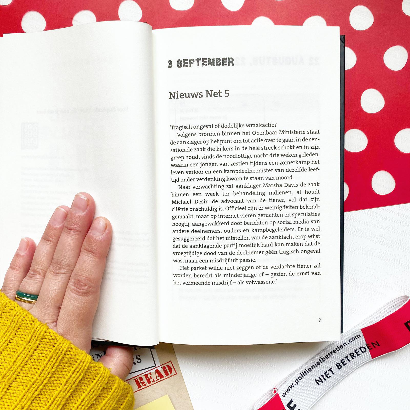 Ik heb dit boek gekozen ter review omdat ik goede leeservaringen heb uit deze reeks. Jacht van Cis Meijer was ontzettend spannend en ook fake trip van Margje Woodrow was spannend en had een aangename connectie met de lezers. Ik begon met lezen in ‘Niemand behalve jij’ en vond het leuk om van nieuwsbericht naar appjes en weer naar een persoonlijke brief te rollen. En ook al staat het netjes aangegeven op de achterkant, ik had niet verwacht dat het hele boek zo zou zijn.