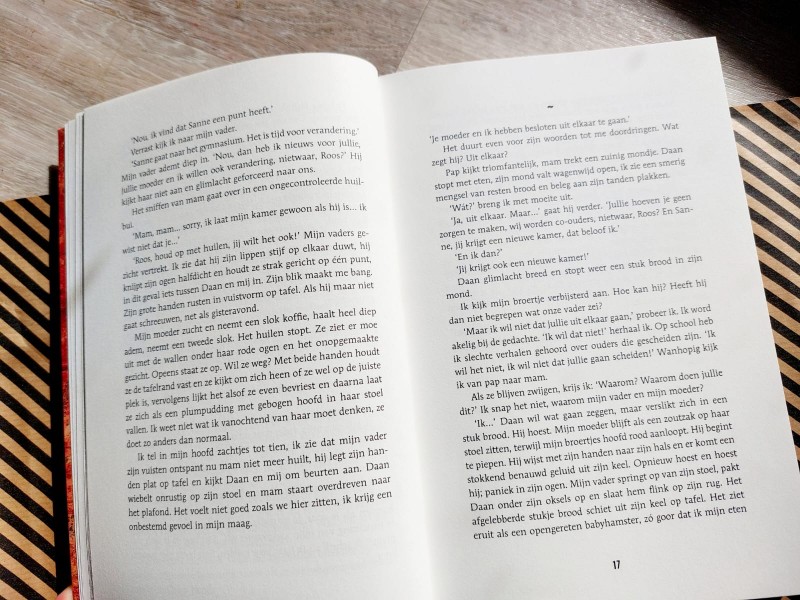 We volgen Sanne een aantal jaar, waarbij ook relaties en vriendschappen zich ontwikkelen. Het is een erg beklemmend en moeilijk verhaal om te lezen. Want de spanningen stapelen zich op en er zijn weinig momenten van vreugde. Het gedrag van hun vader is zo onredelijk, je voelt als lezer ook de boosheid en frustratie. Omdat het verhaal vanuit de ik-vorm is geschreven, komt het nog meer binnen.