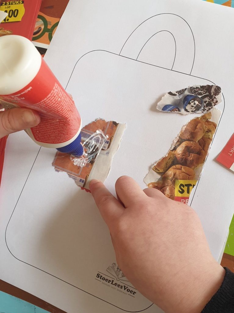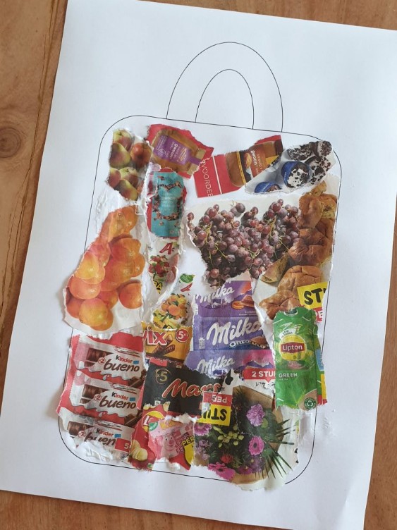 Teken een tas op een vel papier of gebruik de tas hieronder die ik alvast heb gemaakt. Vervolgens kan het kind de boodschappen in de boodschappentas plakken met lijm. Laten drogen en je hebt net zoals in nijntje doet boodschappen een mooi gevulde tas.