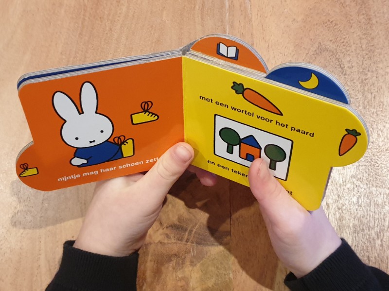 Nijntje en sinterklaas is een stevig kartonboekje. Door zijn kleine formaat is het een ideaal cadeautje voor in de schoen.