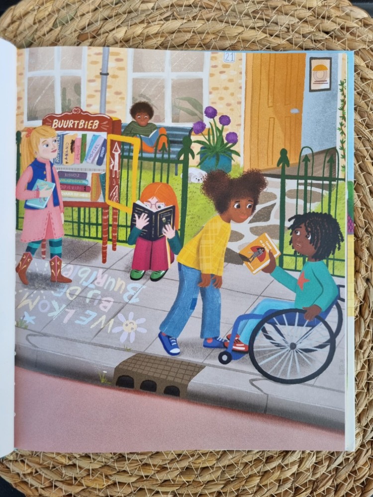 De buurtbieb is mijn favoriete verhaal uit Nine en Mella Bij ons thuis. Natuurlijk omdat ik zelf gek ben op lezen, maar ook omdat de samenwerking tussen de kinderen en de oplossingsgerichtheid zo mooi naar voren komt. Ook wordt hier het thema armoede kort aangestipt, op een luchtige manier.