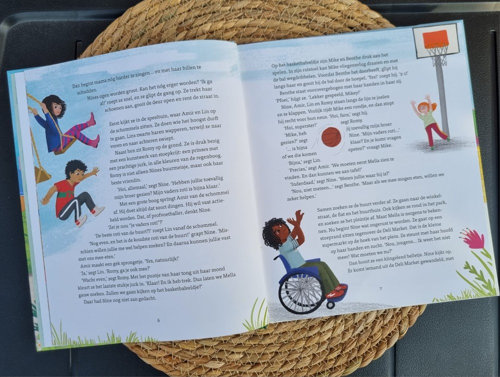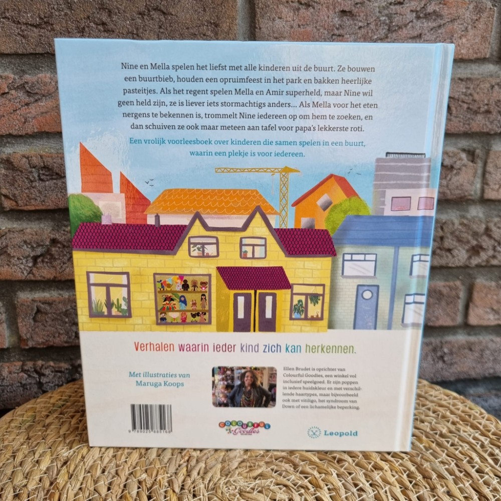 Het fijne aan Nine en Mella Bij ons thuis is dat elk kind zich in een deel van het boek kan herkennen. De kinderen maken namelijk allerlei dagelijkse dingen mee. De inclusiviteit die in dit boek naar voren komt is prachtig. Dit is ook een drijfveer van de auteur Ellen Brudet. Zij is de oprichter van Colourful Goodies, een winkel vol inclusief speelgoed. Er zijn poppen in iedere huidskleur en met verschillende haartypes, maar bijvoorbeeld ook met vitiligo, het syndroom van Down of een lichamelijke beperking.