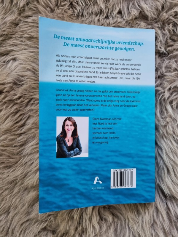 Nooit te laat is een echte roman. Heerlijk om weer eens weg te zwijmelen bij een boek, zonder dat ik bedacht moet zijn op spannende wendingen of moord en ontvoeringen zoals ik meestal lees in de thrillers op mijn stapel. De flaptekst van het boek sprak mij zo aan, dat dit boek direct op mijn lijstje kwam. Een vriendschap tussen een vrouw van mijn leeftijd en een vrouw van 95 jaar zorgde bij mij voor zoveel vragen. Hoe word je vriendinnen als je een zakelijke overeenkomst hebt als verzorgende en cliënt?