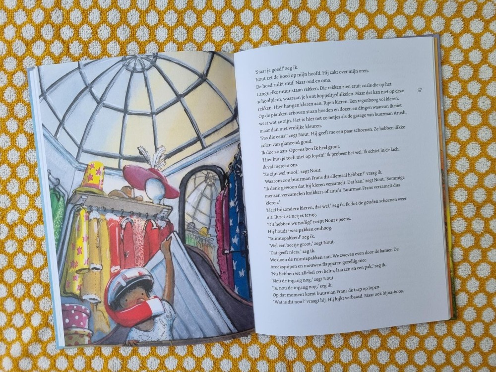 Wat een kleurrijk boek is Nout en ik in de razende ruimte! Als ik het boek opensla word ik heel erg vrolijk en kan ik niet wachten om het te gaan (voor)lezen. Ik zie twee kinderen, gele laarzen, een hond en verschillende achtergronden. Dit is ook precies waar het boek over gaat. Een bijzonder, lief, inclusief boek over dromen en verwonderen. Een aanrader om voor te lezen aan kinderen vanaf ongeveer 5 jaar oud. Ook heel goed zelf te lezen voor wat oudere kinderen!