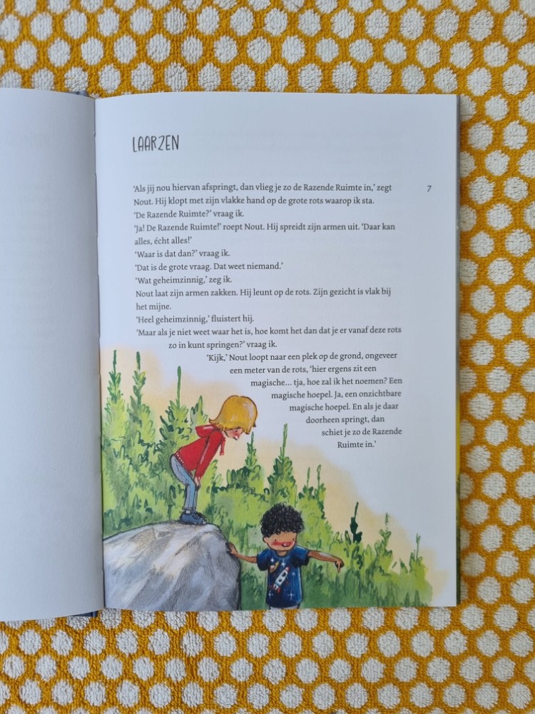 Als jij nou hiervan af springt, dan vlieg ik zo de Razende Ruimte in’ zegt Nout. Hij klopt met zijn vlakke hand op de grote rots waar ik sta.