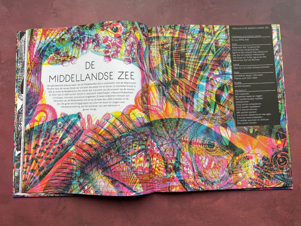 De tekeningen zijn echt prachtig van Oceanorama. Je start elke keer met de oceaanwereld. In deze oceaanwereld staat er elke keer een andere zee of oceaan centraal (bijv. de Noordelijke IJszee, de Stille Oceaan, het Groot Barrièrerif of de Middellandse Zee). Daar lees je wat info over dit specifieke natuurgebied. En zul je onder de indruk zijn van de cijfers! Je kunt daar met je magische lens alvast op ontdekking gaan, maar wanneer je de bladzijde omslaat, kom je bij ‘het uitkijkpunt’ en daar zie je alle kenmerkende dieren, planten en vissen voor dat stuk zee of oceaan.
