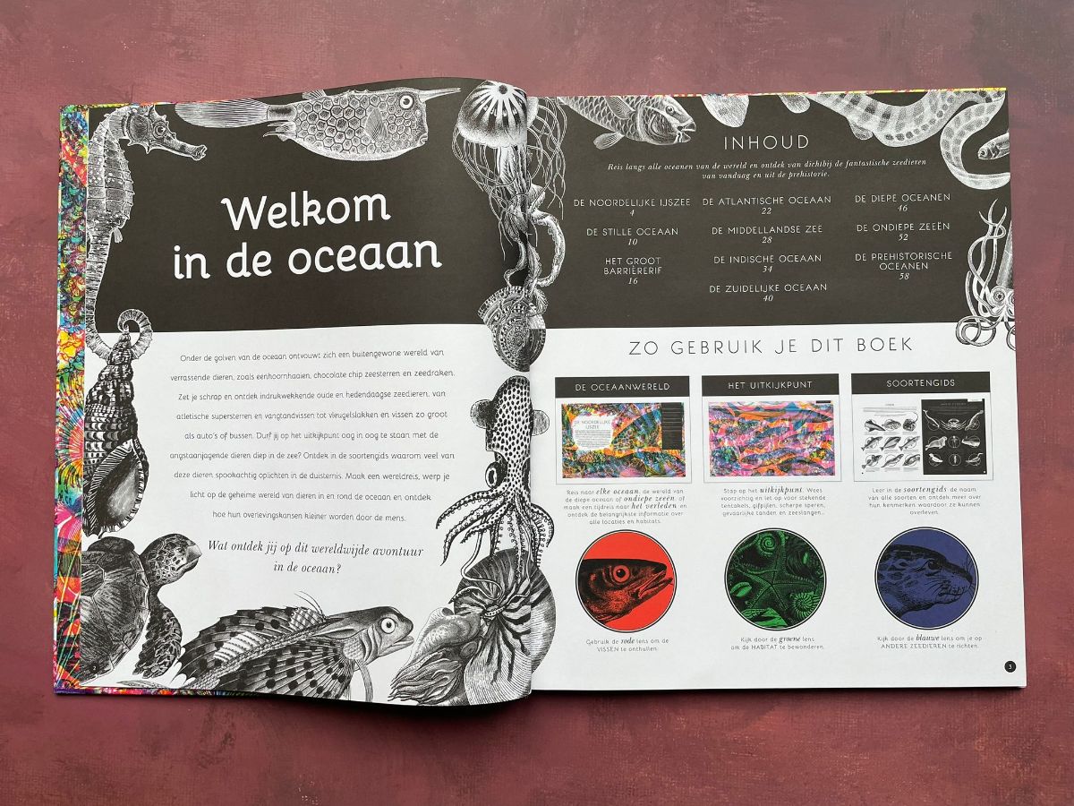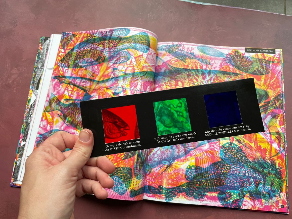 Ken je deze serie nog niet? Lees dan snel verder, en laat je verbazen. Want deze boeken zijn prachtig geïllustreerd, ontzettend leerzaam en vooral gewoon heel tof. Magisch bijna. Er zit een ‘magisch kijkglas’ voorin het boek. Daarin zitten drie verschillende gekleurde lenzen. Als je door de rode lens kijkt, zul je alle vissen kunnen onthullen. Kijk je door de groene lens, dan zie je juist de habitat van de dieren. Hoe ziet hun leefomgeving er eigenlijk uit?