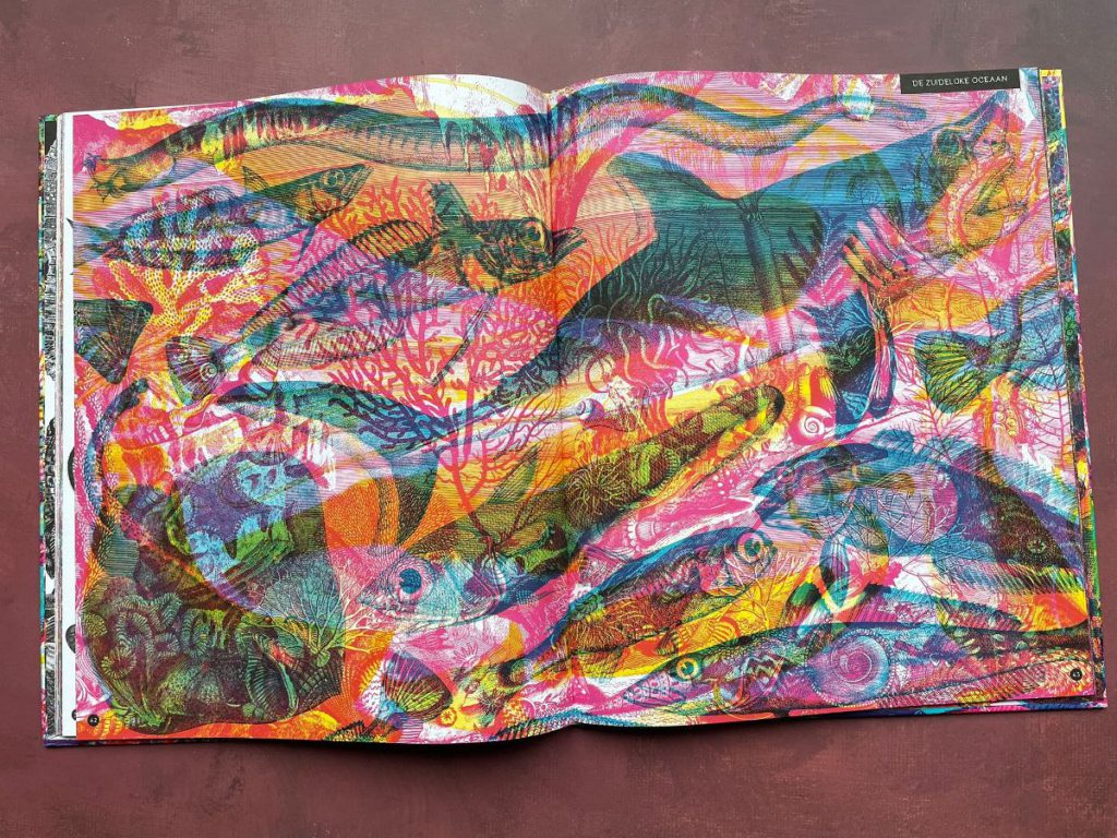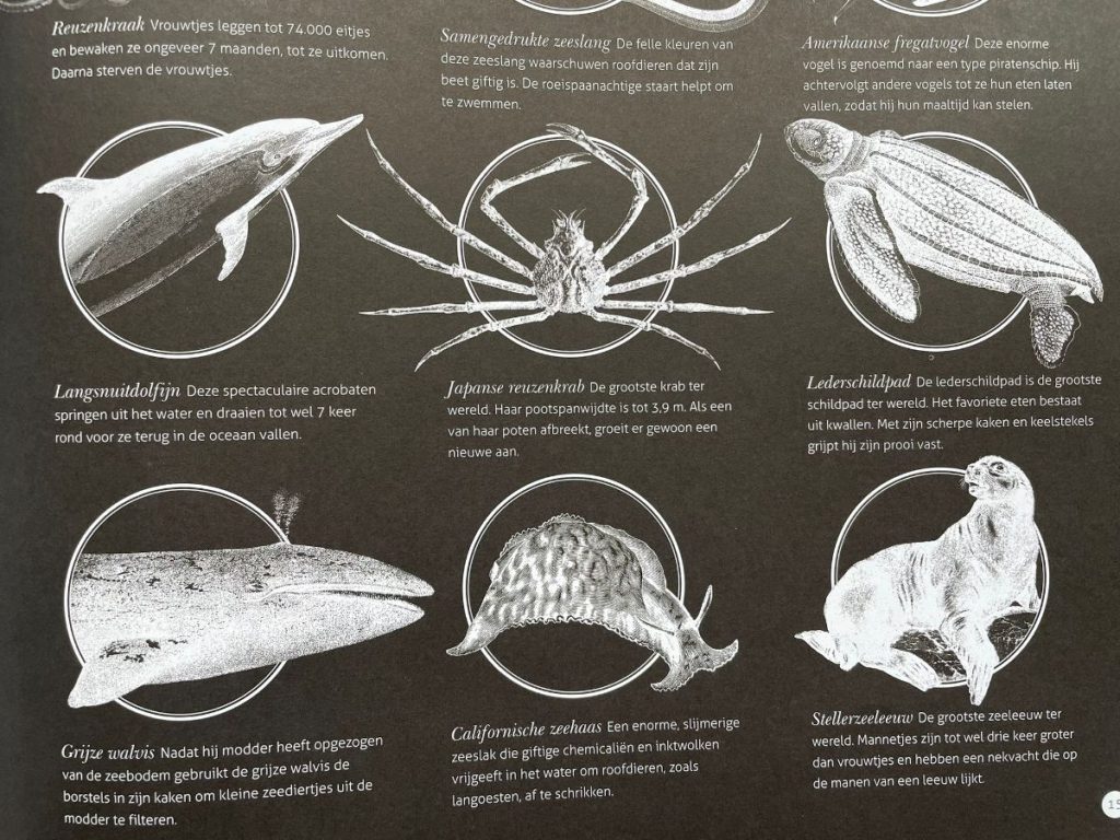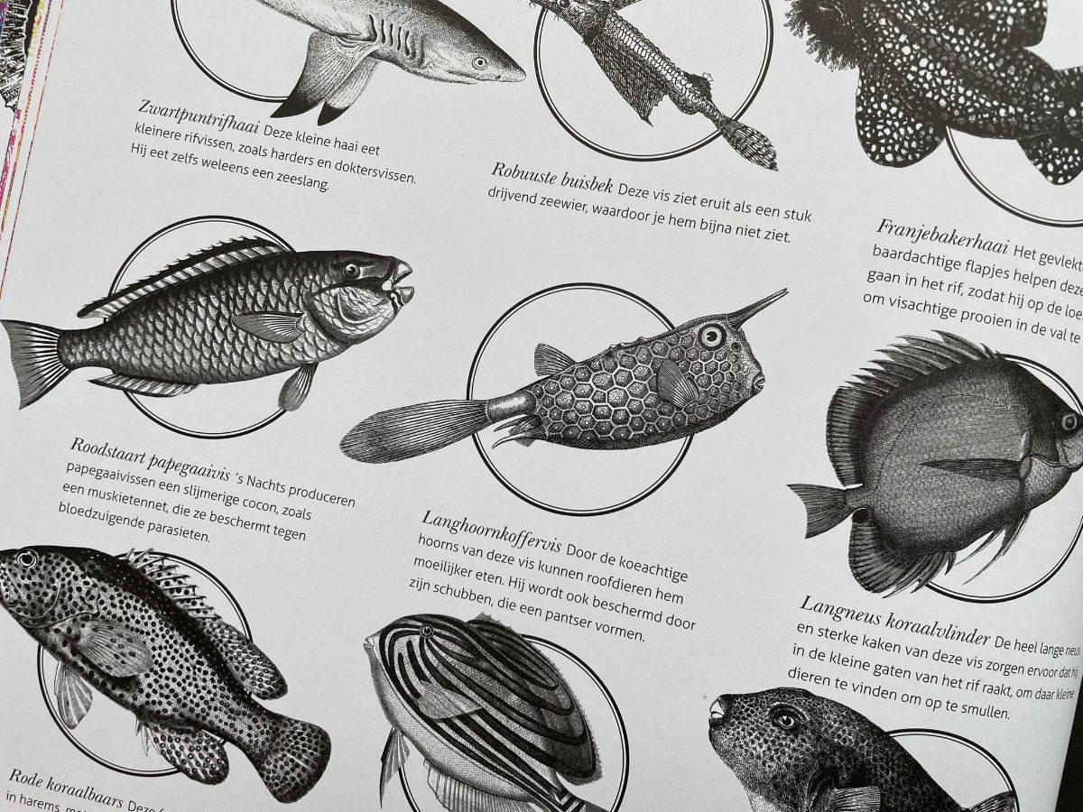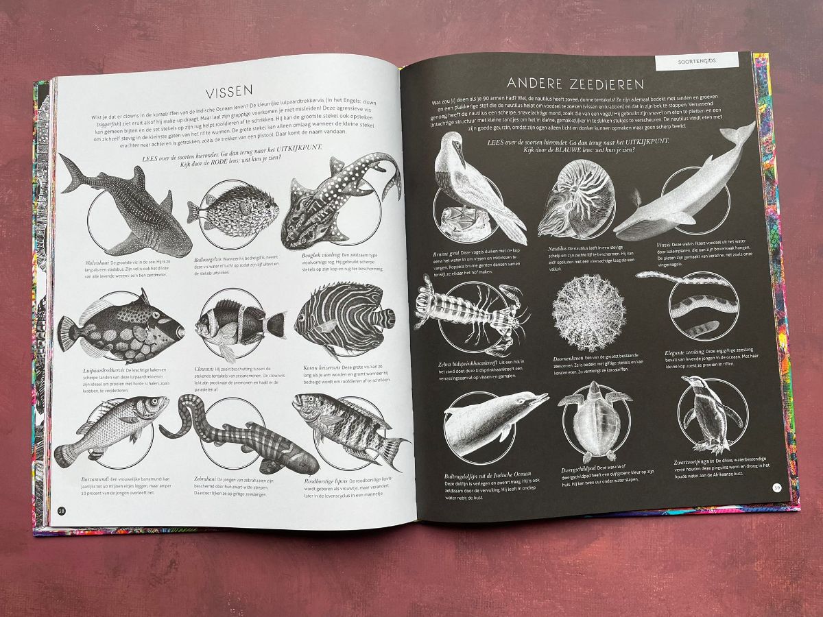Als je bij dat uitkijkpunt dus met je verschillende lenzen kijkt, ontdek je steeds nieuwe dingen. Op de volgende pagina’s van Oceanorama kun je dan kijken of je alle vissen en andere zeedieren hebt gevonden. Daar worden deze dieren namelijk allemaal los getekend. (de tekeningen zijn fijne potlood- of pentekeningen in zwart-wit, met ontzettend veel details). Daar lees je van ieder dier zijn naam, en een leuk weetje. Leuk om te vermelden is dat achterin het boek nog een hoofdstuk is opgenomen over de prehistorische oceanen. Daar kun je dus speuren naar inmiddels uitgestorven dieren.