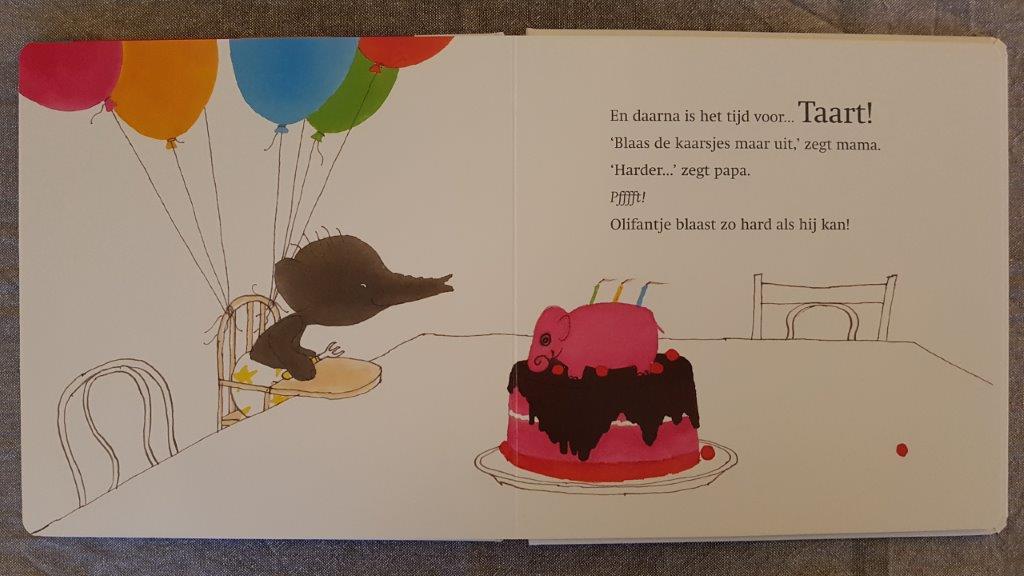 Mijn zoontje weet het al vóórdat hij Olifantje is jarig heeft gelezen. Vanmiddag zijn we naar de winkel geweest. Hij heeft cadeautjes voor me gekocht. Dat zal nog wat worden later als hij zijn eerste salaris binnen heeft. Ik denk dat het volledig opgaat aan cadeautjes voor mama, haha. Maar ook dacht hij aan de andere dingen die nodig zijn voor een verjaardag. Ballonnen en een feestmuts kocht hij ook. En niet te vergeten kaarsjes voor de taart! Ik zal mijn zoontje na het voorlezen vragen wat mama wél heeft en wat Olifantje niet had in het verhaal. (De feestmuts!)