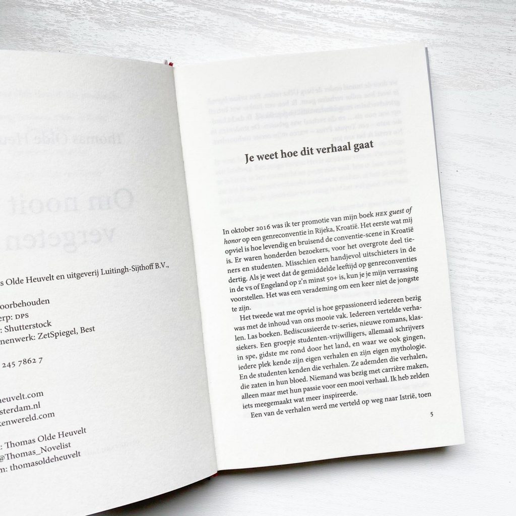 Om nooit te vergeten is pas het topje van de ijsberg natuurlijk. Al zijn korte verhalen vaak juist groots in hun impact. Een goede auteur laat zijn kracht zien met beide. Ik vind de verhalenbundels van King, Barker en Gaiman namelijk heel waardevol. Al staan ze meer bekend om de langere werken (Barker uitgezonderd met zijn Boeken van Bloed). Ik ben aangenaam verrast door de bevestiging van mijn verwachtingen die ik had van Thomas. De manier van verhalen vertellen zit in zijn bloed en ademt door alle regels en woorden heen. Ik ben blij dat ik een klein beetje Thomas Olde Heuvelt heb leren kennen, en ik kijk uit naar meer van deze auteur!