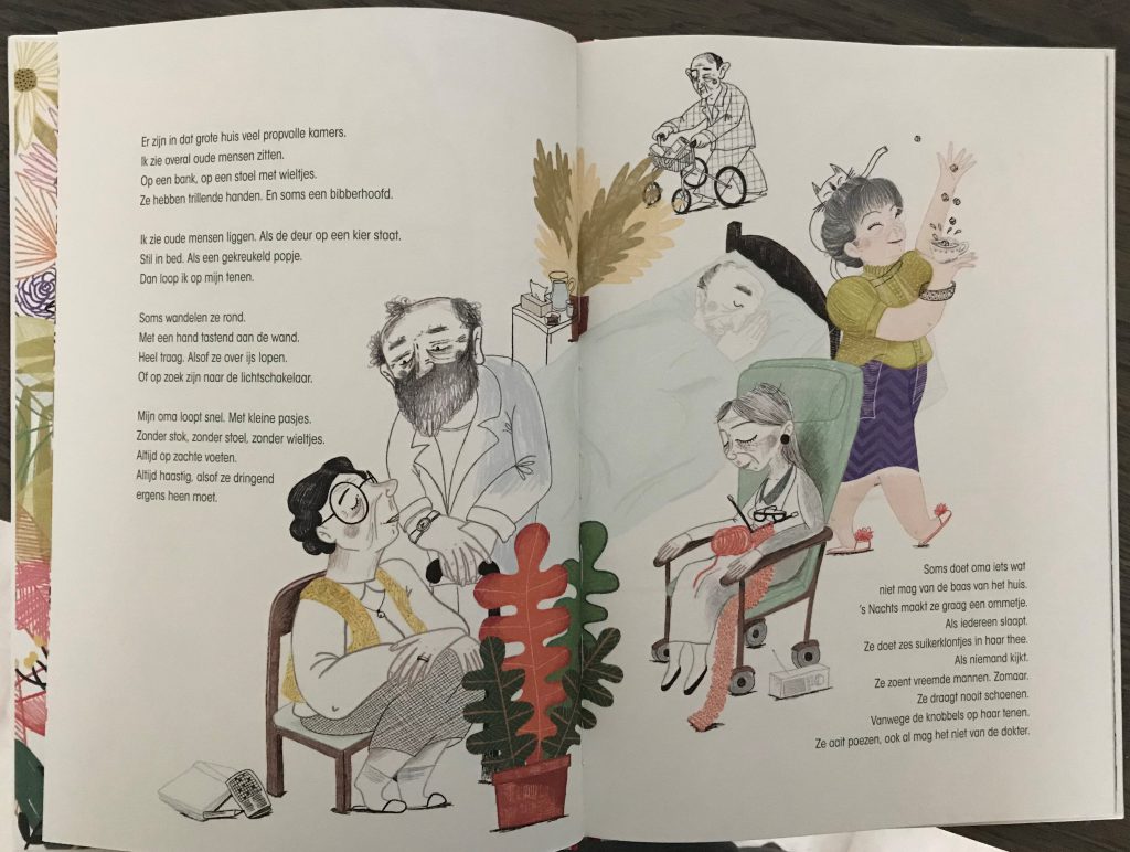 ‘Oma ondersteboven’ is geen verhaal wat je ‘even snel’ voorleest. Het is een boek wat ik prima geschikt vind om in etappes voor het slapen gaan voor te lezen. Er gebeurt veel in het boek, dus ook met een kort stukje lezen is er van alles aan de hand met oma. De platen in het boek dagen een kind uit om zelf mee te denken en over het verhaal te praten.