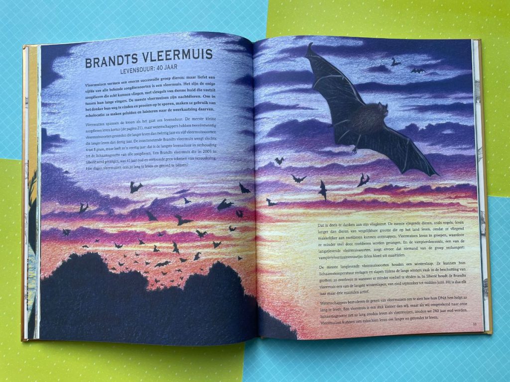 In het boek Onze tijd op aarde worden de dieren met de kortste én langste levens besproken. Denk bijvoorbeeld aan de eendagsvlieg, valdeurspin, reuzenkraak, Groenlandse haai, zeekrokodil en de onsterfelijke kwal. Ik vond het heel interessant om te lezen dat elk zoogdier (met uitzondering van de mens) vanaf zijn geboorte dezelfde voorraad hartslagen heeft: ongeveer een miljoen. Dieren met een ontzettend hoge hartslag, zullen dus een veel korter leven hebben dan dieren met een lage hartslag.