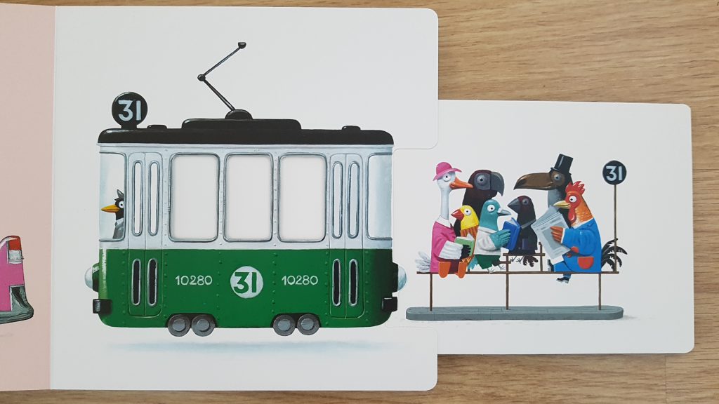 Best grappig dat taxi’s er vaak geel uitzien in boekjes, terwijl ze in Nederland eigenlijk alleen te herkennen zijn aan een blauwe kentekenplaat. Toch weet mijn zoontje nu dat het een taxi is en dat ziet hij gezien zijn leeftijd, ruim 2,5 jaar, (nog) niet aan de letters. In Boedapest waren de taxi’s namelijk wél allemaal geel. En die zag je echt overal in het drukke verkeer. Het leuke van Op weg is dat ik nu pas goed kan uitleggen wat een taxi eigenlijk precies is, doordat er via de draaischijf steeds een andere klant in de taxi zit.