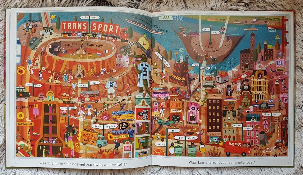 Eigenlijk is dit meer een zoekboek. Elke twee pagina’s is een groot deel van een stad. Daaronder staan vragen als Wie bestuurt de metro? Waar gaan de beren overwinteren? Waar brandt het? En hoeveel brandweerwagens tel je?