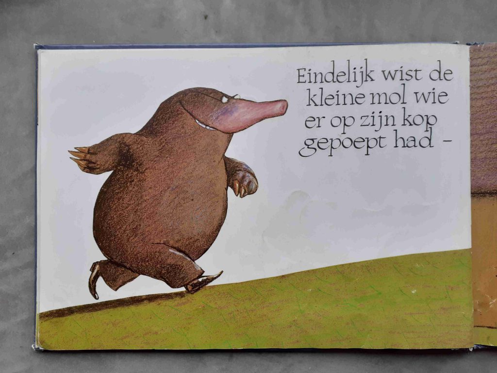 Wat een pech voor kleine mol. Kom je even boven de grond en dan wordt er zomaar bovenop je kop gepoept! Een hilarische zoektocht start naar de dader. Over een kleine mol die wil weten wie er op zijn kop gepoept heeft is een grappig prentenboek over een bijzonder avontuur, waar vele peuters en kleuters geen genoeg van krijgen om te lezen.