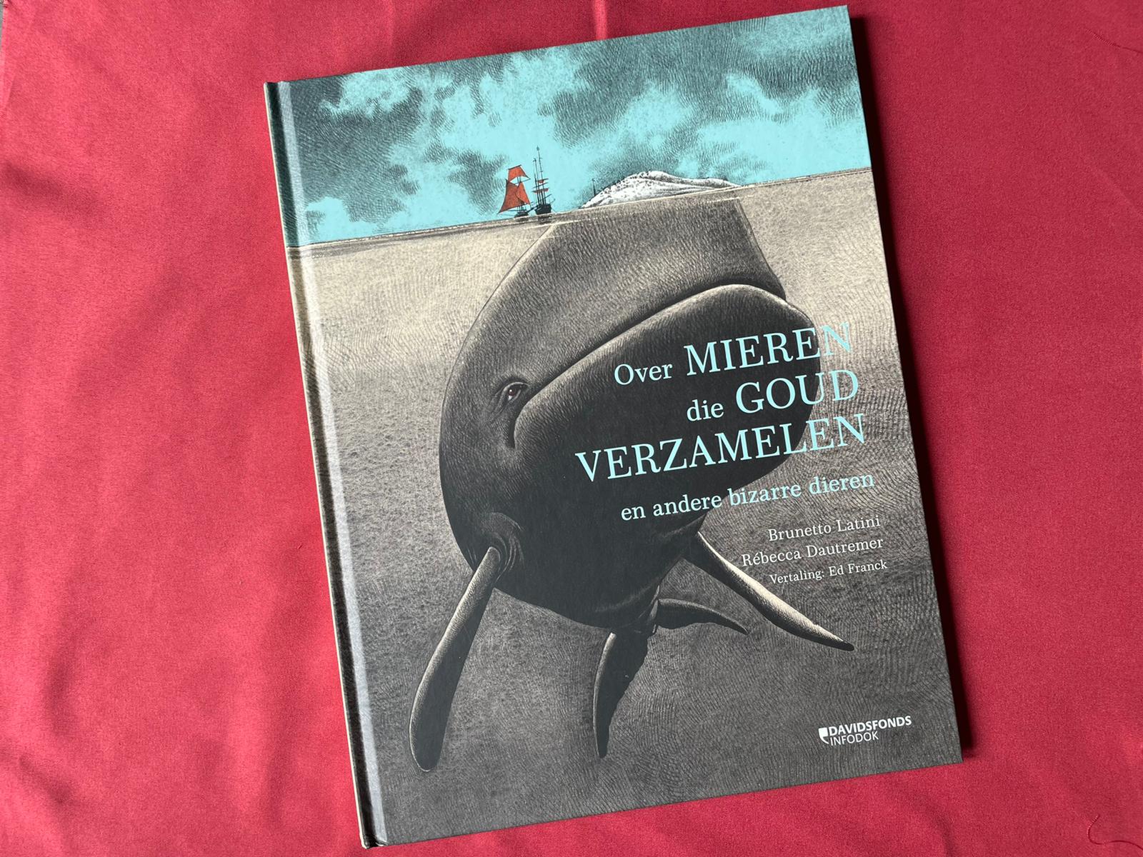 De kaft van ‘Over mieren die goud verzamelen’ springt enorm in het oog en trekt meteen je aandacht. Wat een prachtige tekening! Je ziet een gigantische walvis, maar als je beter kijkt, dan valt het op dat het puntje van zijn kop een eiland is. Hoe zit dat precies?