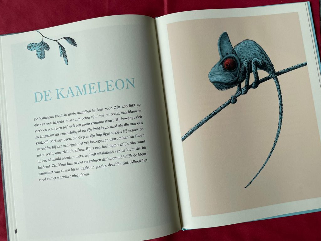 In het begin vroeg ik me een beetje af wat Over mieren die goud verzamelen nu eigenlijk voor een boek is. De prachtige tekeningen vielen meteen op. Maar toen ik de teksten ging lezen, was ik wel een beetje verbaasd. De eerste dieren die besproken werden waren een draak en een slang met twee koppen. Vervolgens werd daarna de doodgewone ooievaar besproken. En de feitjes in het boek zijn wel een beetje gek: hoezo eet of drinkt de kameleon niets en leeft hij uitsluitend van de lucht die hij inademt?