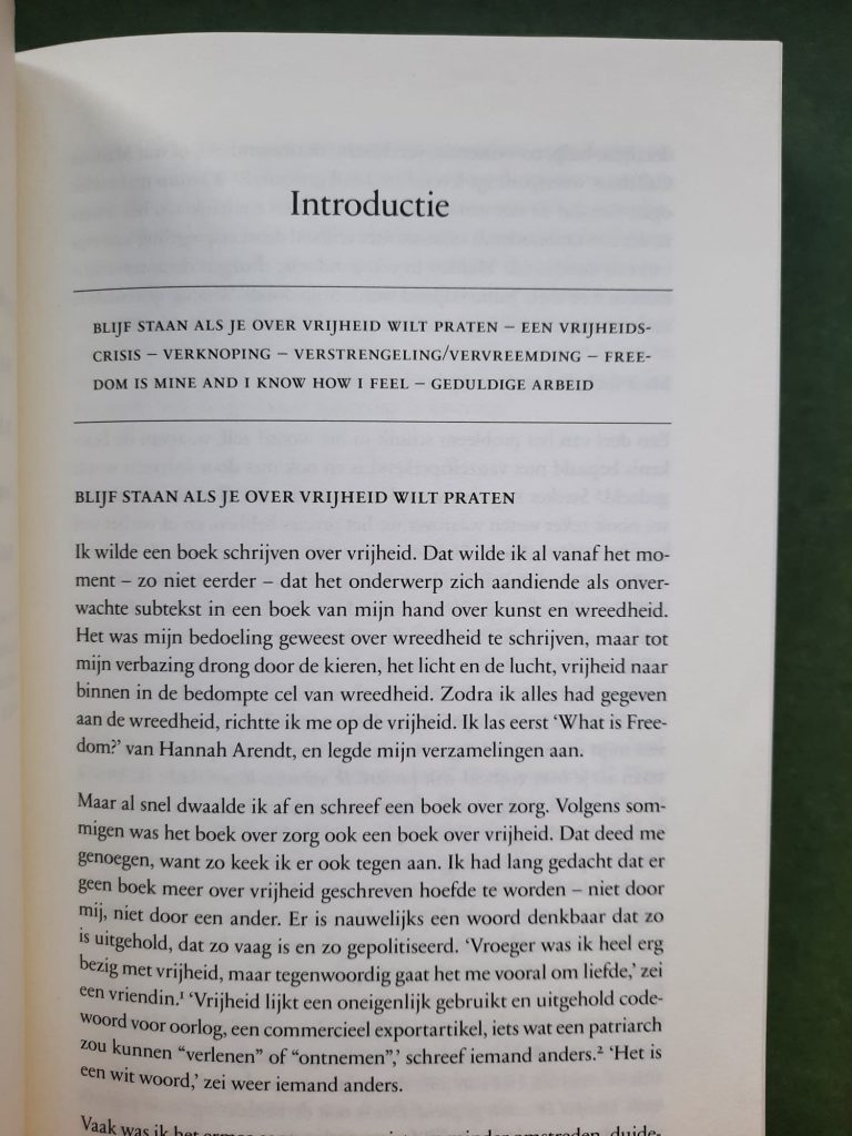 In Over vrijheid staan verschillende interessante dingen om verder over na te denken, of na te praten. Juist door te kijken naar vrijheid, kom je grenzen tegen. Volgens Nelson is het vooral een beoefening van je mindset, in plaats van 1 groot gevoel van vrijheid. Ik denk dat er nog veel meer uit het boek te halen is, maar ik vond het best een lastig boek om zo in te stappen. Het voelde, zeker bij het hoofdstuk over kunst, alsof ik een inleiding op het thema gemist had. Nelson heeft veel kennis te delen en haalt veel aspecten, bronnen en inspiratie aan, waardoor ik lastig vond om het goed te volgen en te behappen.