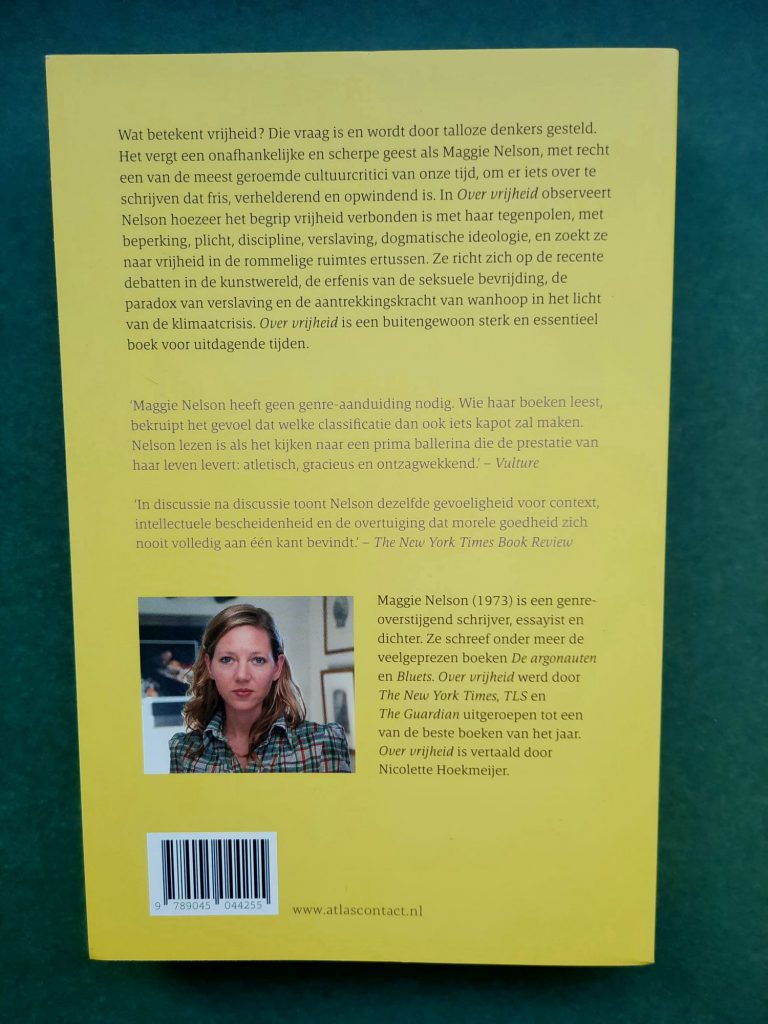 Over vrijheid is geschreven door de Amerikaanse Maggie Nelson. In Over vrijheid duikt ze dieper op dit thema in in de wereld van de kunst, seks, drugs en klimaat. Wat betekent vrijheid eigenlijk? En om vrijheid te onderzoeken en te voelen, zijn ook de tegenpolen nodig zoals regels, verslavingen enz. In Over vrijheid gaat Nelson op een verkenningstocht en bekijkt ze verschillende discussies en situaties op de vier invalshoeken. Het resultaat daarvan is een uitgebreid boek, op het snijvlak van verschillende wetenschappen, zoals filosofie en geschiedenis.
