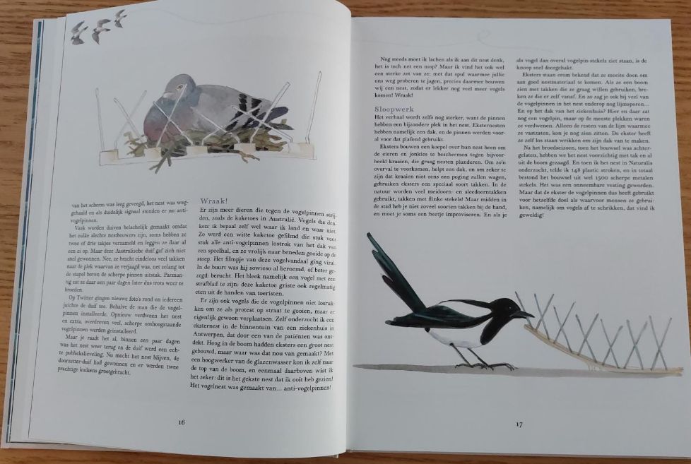 Perronpapegaaien en krekelcriminelen staat bomvol met leuke anekdotes en verhalen van de schrijver van het boek. Hij weet je echt te boeien en met veel plezier heb ik al een aantal verhalen gelezen. Zoals de duif die zijn nestje maar bleef maken bovenop de vogelpinnen die haar eigenlijk weg zouden moeten houden. Of de slechtvalk die zijn eten voor later op de vogelpinnen boort. Sja dat is nog eens een andere manier om je eten te bewaren natuurlijk.