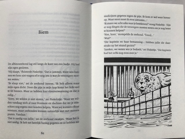 Avontuurlijk, spannend en leuk volgens mijn dochter (7). Hoezo dan? Nou mam, Je weet dat de kapitein interesse heeft in Biem, maar je weet niet hoe dat dan gaat gebeuren. En dan gebeurt het en dan wordt het uiteindelijk superspannend. En wat gaat er gebeuren denk je nu? beste lezer. Tja, ik wil natuurlijk niet al te veel verklappen. Maar, Biem is een zeehondje dat een albino is. Hij is na een zware storm op het strand van Texel terecht gekomen. Hij wordt opgevangen in Ecomare. Het opvangcentrum op Texel. Pinkeltje heeft een voorgevoel dat Biem gevaar loopt. En Pinkeltje zijn voorgevoel is bijna altijd juist. Ook deze keer. Gelukkig is Pinkeltje slim en weet hij altijd wel een oplossing.