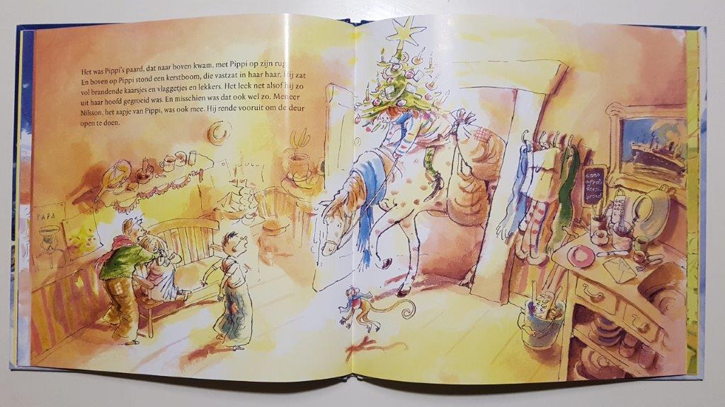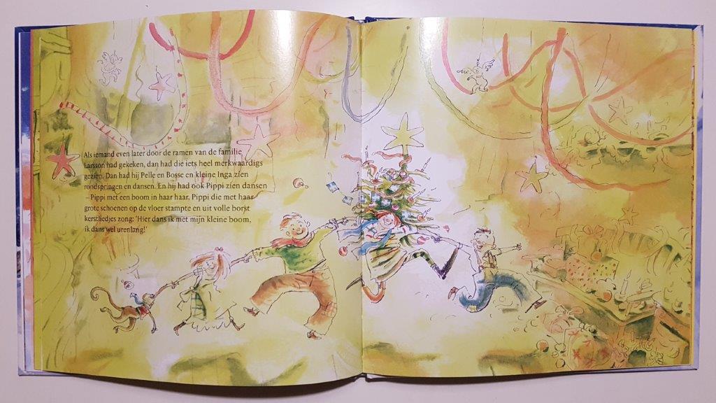 Het verhaal gaat op de volgende pagina verder met: “Nu zal ik je vertellen wat Pippi een keer gedaan heeft.” En alsof het mijn eigen herinneringen zijn, luistert mijn zoontje geboeid naar het verhaal. Het begon best verdrietig met de drie kinderen van de familie Larsson die huilden omdat hun moeder in het ziekenhuis lag en hun vader voor zijn werk op zee was. Pelle, Bosse en Inga schrokken op door een raar lawaai op de trap. Het was Pippi en de dansende kerstboom. Althans, het lawaai kwam van Pippi haar paard. Pippi zat op zijn rug met op haar hoofd een kerstboom, met brandende lampjes erin en vlaggetjes en lekkers. Meneer Nilsson (het aapje) hield de deur voor ze open.