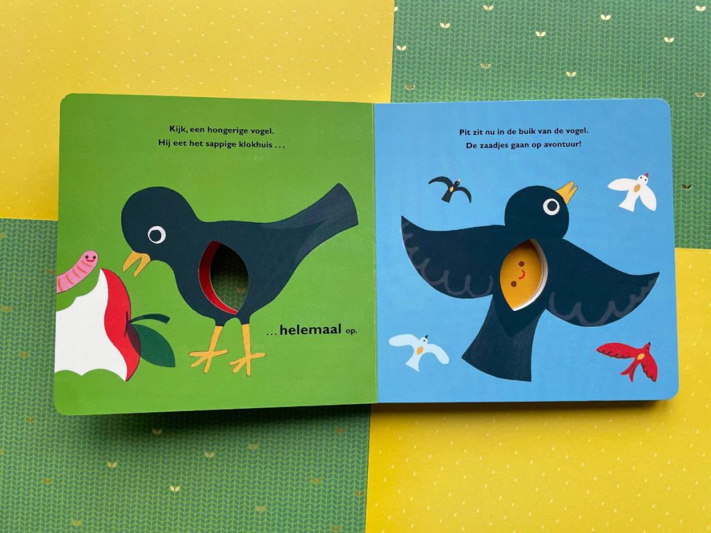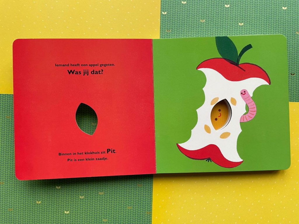 Als klein kind wilde ik altijd de pitjes van mijn appel bewaren. Ik wilde deze planten en hoopte dan altijd dat er een echte appelboom uit zou groeien. Dat is bij mij helaas nooit gelukt, maar het kartonboekje ‘Pit’ gaat over de avonturen van een klein zaadje, dat langzaam steeds groter groeit.