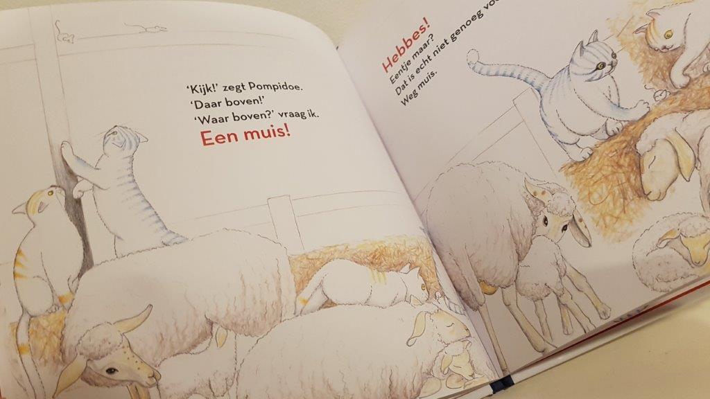 Poes is niet alleen erg benieuwd naar de lammetjes, maar ook naar wat er te eten valt in de stal. Ze lust best wel een muis, maar die heeft ze nog niet gezien. Mijn zoontje en ik weten op elke pagina wel muisjes te ontdekken hoor! Al zitten ze soms best goed verstopt.