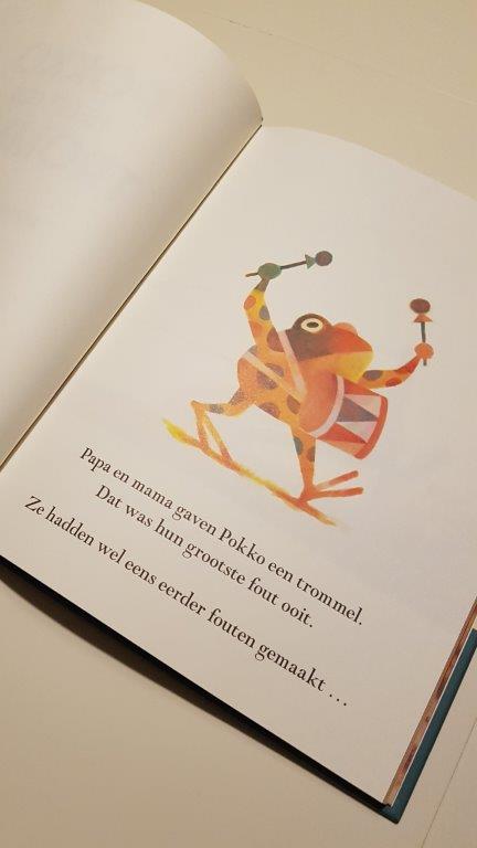 De ouders van Pokko noemden het de grootste fout ooit dat ze hun kind een trommel gaven. Mijn haren gingen er in eerste instantie van overeind gaan. Hoe kun je dat nou fout noemen wanneer je een kind ergens blij mee maakt? Maar toen ik op de volgende bladzijden las waarmee ze nog meer de fout in waren gegaan, zag ik de humor er wel van in. Al vond ik het wel zielig voor Pokko dat ze met haar trommel naar buiten werd gestuurd toen papa en mama het geluid niet konden verdragen.