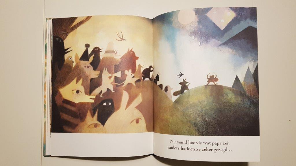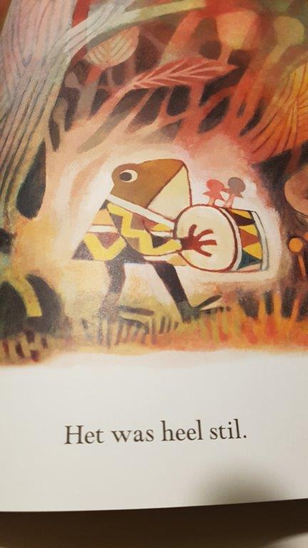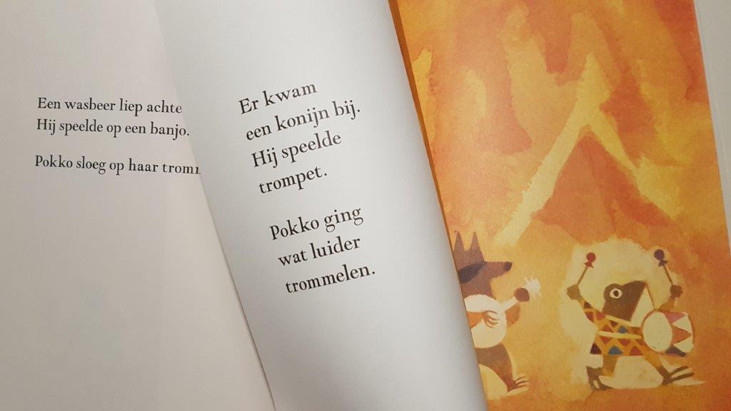 Nog zieliger voor Pokko vond ik het toen ik las dat het zo stil was en dat ze maar zachtjes op haar trommel sloeg zodat het wat minder stil was. Achter haar hoorde ze iets bewegen. Best een beetje spannend, vond mijn zoontje dat. Maar al gauw bleek dat een wasbeer te zijn die op het getrommel afkwam met zijn banjo. Daarna volgde een konijn. En hoe harder Pokko op haar trommel sloeg, hoe meer dieren erbij kwamen. De wolf was iets minder welkom, want die at het konijn op in de stoet. Maar toen de wolf beloofde dat niet meer te doen, gingen ze weer vrolijk verder.